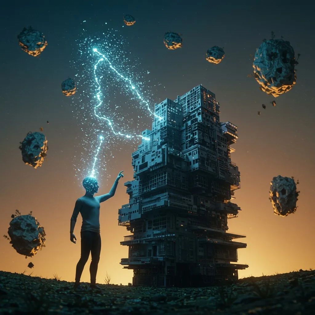 * 英語: person with nebula-like glowing head, thoughts flowing like blue electricity into building, floating rocks, twilight
